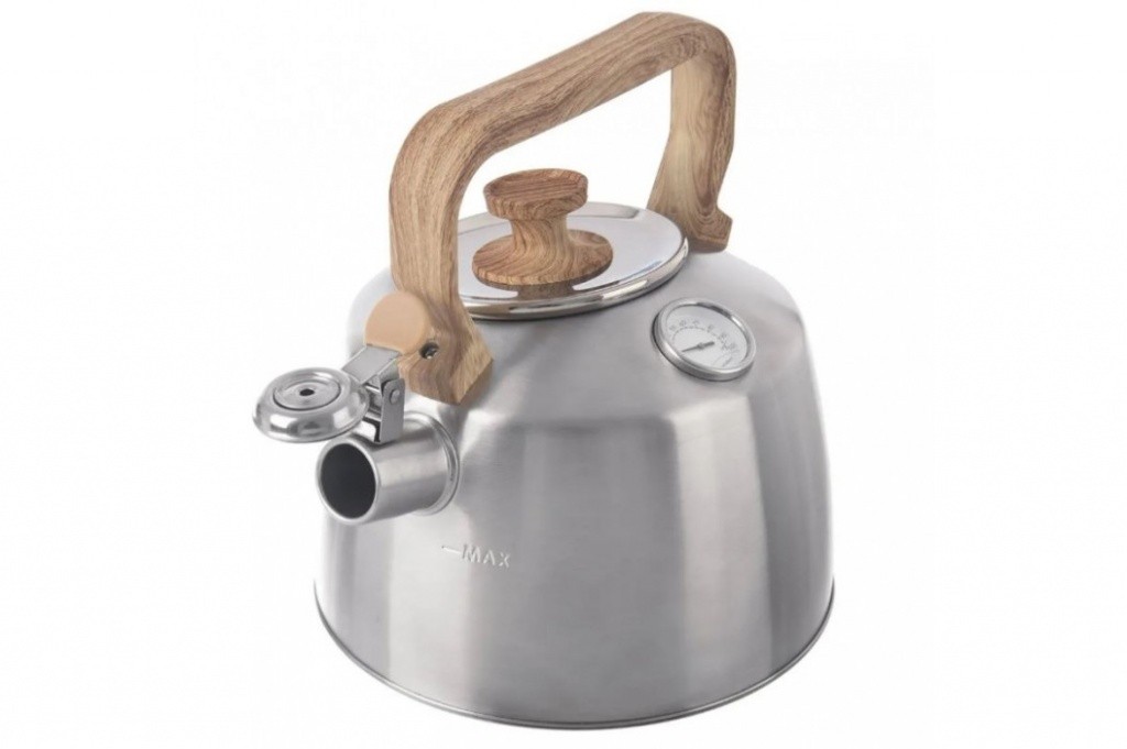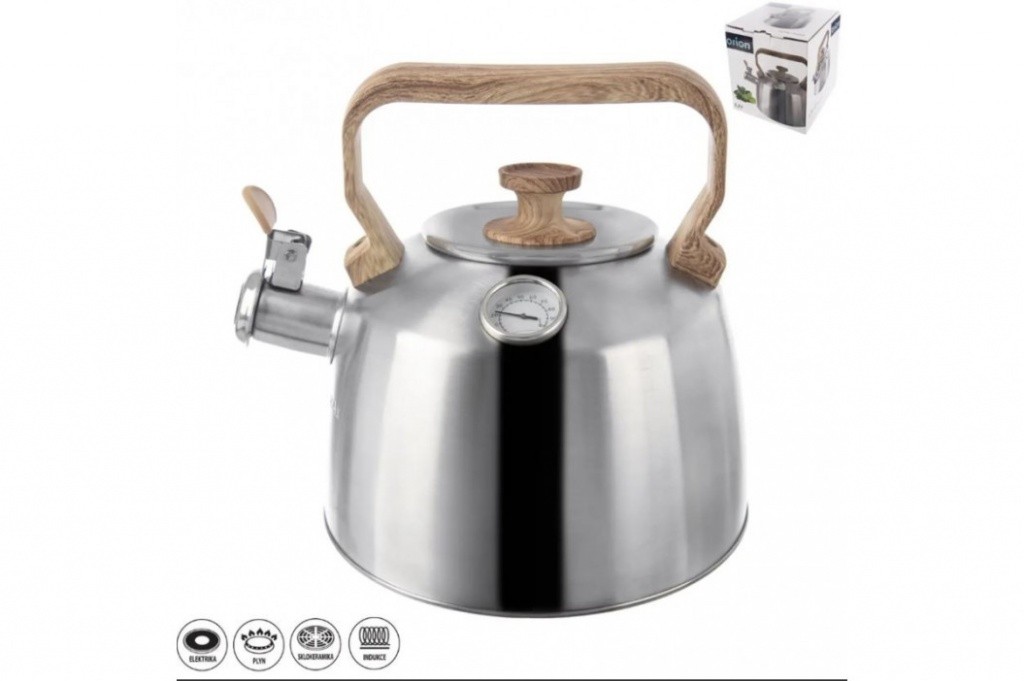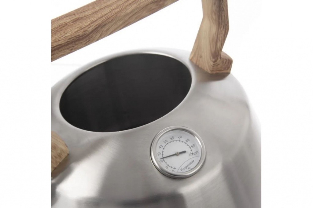 Luxusní čajník s odklápěcí píšťalkou a s teploměrem je vyroben z kvalitního nerezu v moderním designu. Rukojeť a úchyt v dekoru dřeva. Skvěle se uplatní jak v klasické, tak moderní kuchyni. Teploměr ukazuje aktuální teplotu vody v konvici, stupnice do 100 °C, teploměr je velmi praktický pro přípravu bylinných nálevů nebo pokrmů vyžadujících přesnou teplotu vody (sunar, kaše...). Materiál: nerez (tělo 201s/s, dno 430s/s, víko 201s/s), plast nylon, silikon. Rozměry: celkový objem 3,2 l, užitný objem 1,9 l – hladina MAX, pr. 20 cm, v. 21 cm. Vhodný na všechny typy spotřebičů. Čajník je nutné plnit minimálně do poloviny, aby nedocházelo k jeho přehřívání. Barevné změny na vnějším povrchu při nedodržení minimálního plnění nemohou být důvodem k reklamaci. Není vhodný do myčky.
