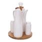 Dochucovací souprava na podnosu - olej, ocet, sůl a pepř budete mít po ruce při vaření i při stolování. Materiál: porcelán, bambusové dřevo, plast, korek. Rozměry: láhev na olej a na ocet - objem 0,3 l, pr. 6 cm, v. 19 cm, solnička a pepřenka pr. 4 cm, v. 9 cm, podtácek pr. 17,5 cm, v. 22 cm. Porcelán vhodný do myčky na nádobí.