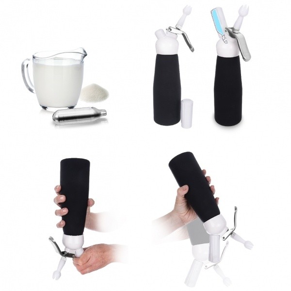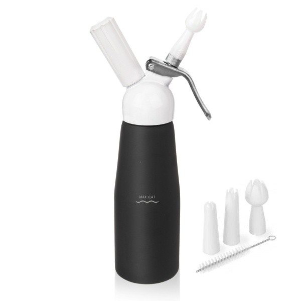 Šlehačková láhev o objemu 0,68 l pro přípravu poctivé domácí šlehačky s třemi nástavci pro přípravu klasické šlehačky ke zdobení sladkých dezertů, ale i slaných pěn, espumy, nebo ke zjemnění omáček.Tato velikost je vhodná pro výrobu a podávání šlehačky o objemu 0,25 l - 0,33 l.