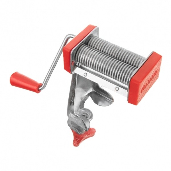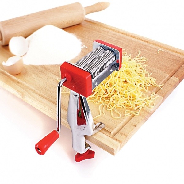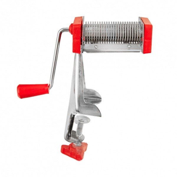 Máte rádi, když jsou nudle v polévce stenoměrné, tenké a navíc z domácích vajec? Ručně se to většinou tak pěkně nepovede. S tím může pomoci mechanický kovový strojek s plastovými částmi, který plně nahradí běžné krájení nožem.Připravené vyválené těsto nakrájené na 6 cm široké pruhy stačí vložit mezi ozubené části a otáčením klikou dosáhnete stejnoměrných polévkových nudlí, tenkých cca 1 mm. Délku můžete zvolit dle libosti.